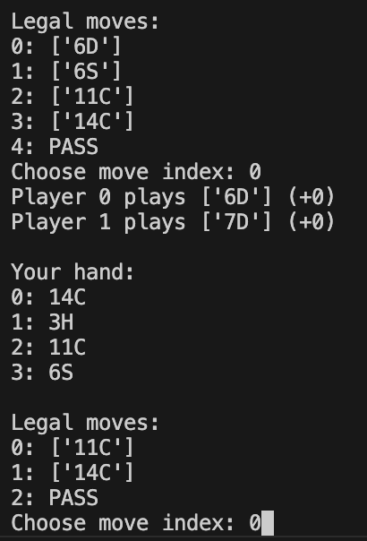 before I could even think about training an agent, I first had to simulate the game environment, since there was no existing implementation anywhere online. that meant writing the ruleset from scratch, representing actions, and encoding them in a way that a policy could actually train on. a snippet from a playtest: