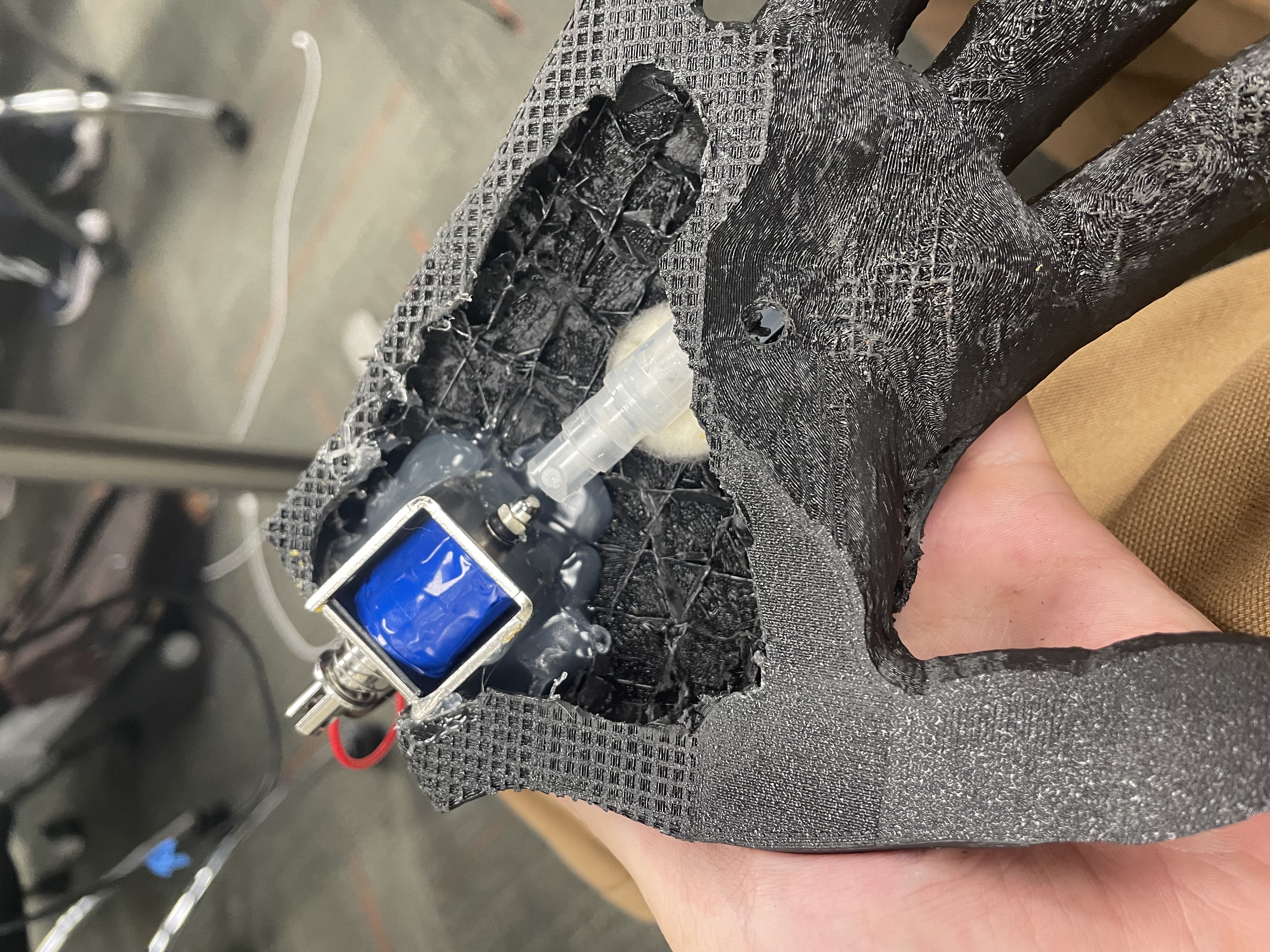 for good measure, we also wanted to make our hand self-sanitizing. this was done by dremeling out a pocket to hold a vial of liquid sanitizer and a solenoid to spray it at each handshake's falling edge: